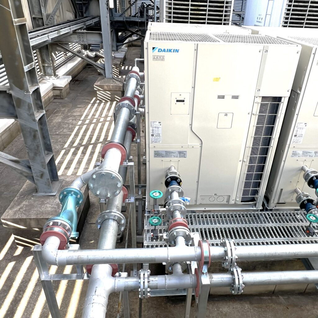 写真のように、屋上の熱源機器まわりに配管ユニットを並べて据え付けました。