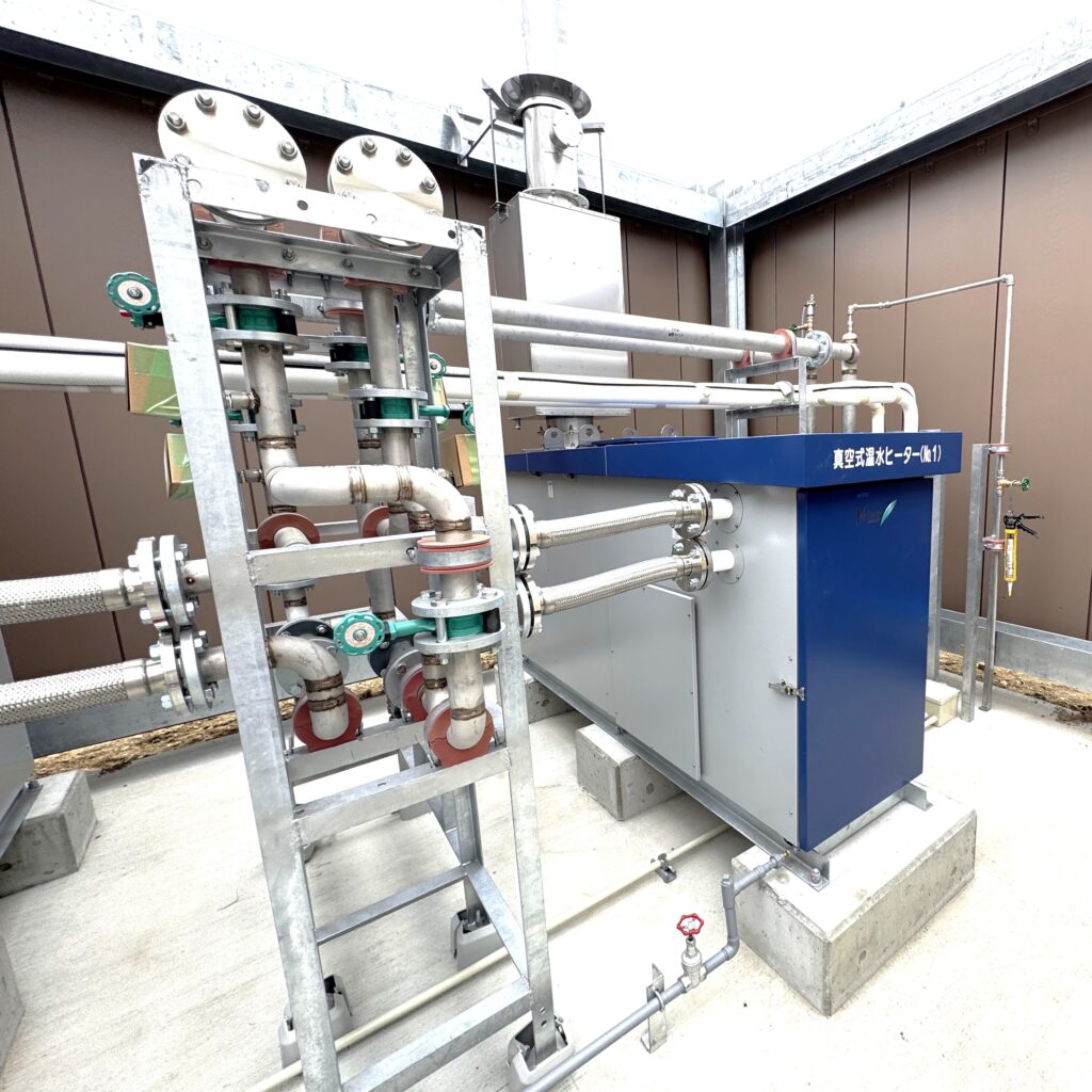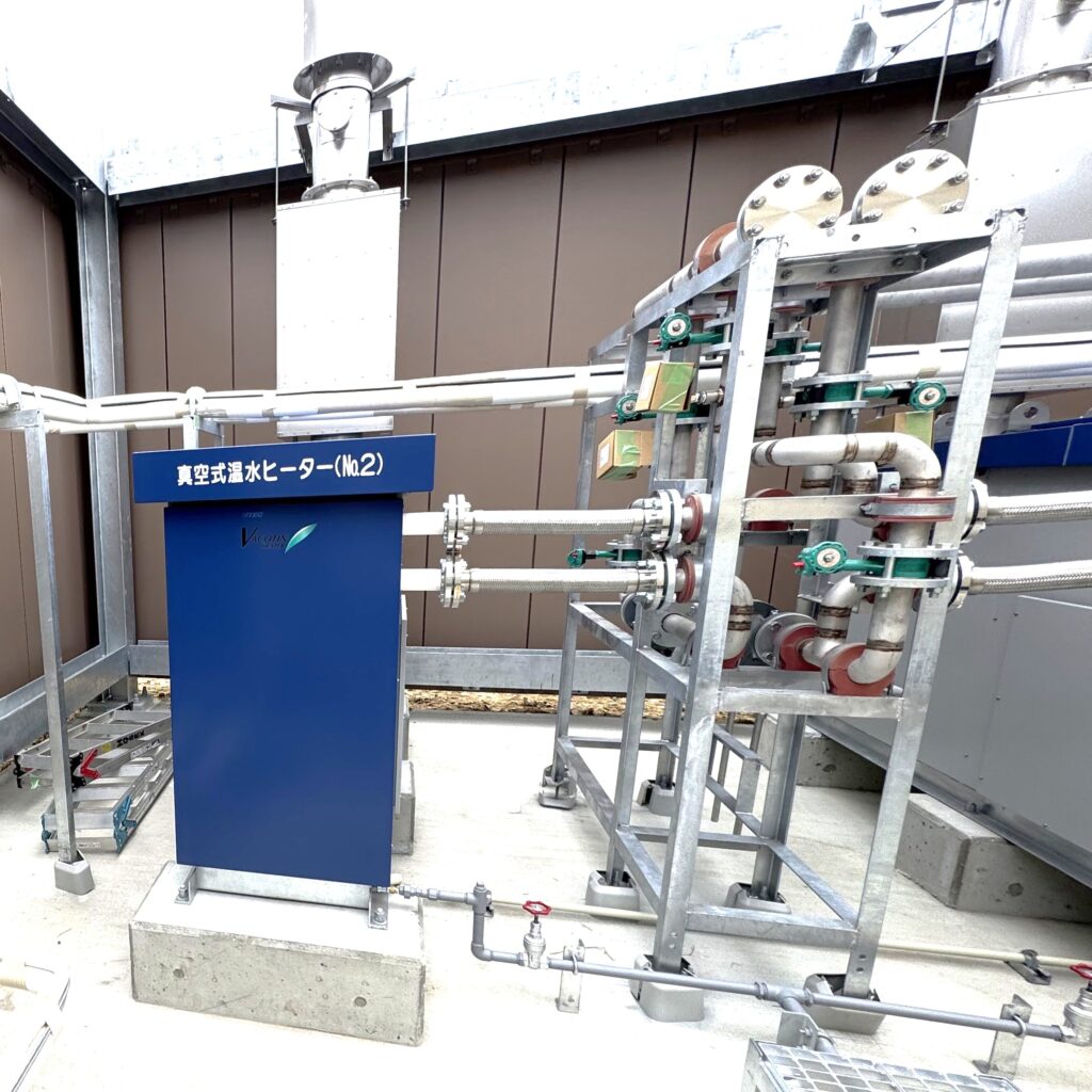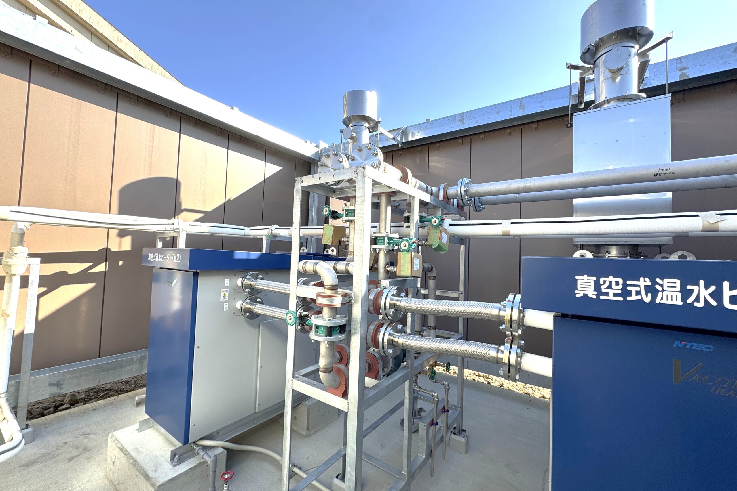 青空の下、2台の「真空式温水ヒーター」の間に、てつまどで製作した配管ユニットがしっかりと納まりました。